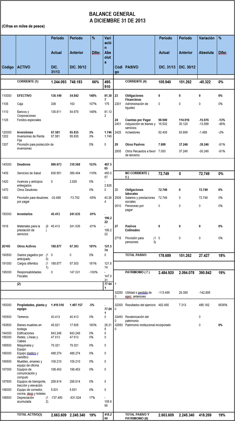 Una vez evaluada la ejecución presupuestal de ingresos con corte al mes de Diciembre de 2013 se identifica un nivel de ejecución general del 90%, en donde los porcentajes más representativos están dados por la venta de servicios de salud, los cuales presentaron unos niveles de ejecución del 85% del total proyectados representados en $ 2,885 millones , así mismo identificamos un gran esfuerzo en el cumplimiento de las proyecciones de cuentas por cobrar de vigencias anteriores las cuales presentaron unos niveles de ejecución por el orden de los $293 Millones y otros ingresos no operacionales con un valor de $298 Millones representados en un 190%. Los cuales incluyen $120 millones de proyecto de dotación de equipos.