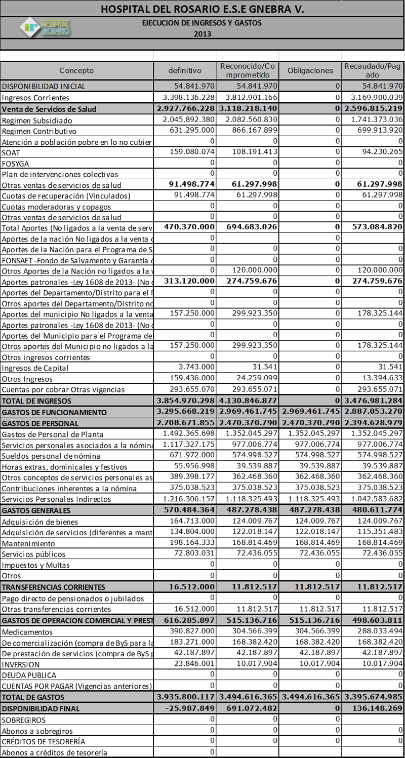 Una vez realizado el cierre de vigencia presupuestal con corte a diciembre 31 de 2013, el Hospital del Rosario E.S.E presento la siguiente ejecución; del total de recursos presupuestados el Hospital ejecuto un 89%, así mismo identificamos dentro del proceso de ejecución del gastos que del total de los recursos comprometidos la empresa pago un 97% el total contratado, cifra representativa si nos ubicamos en el contexto sobre el cual el recaudo fue muy difícil debido a la crisis del sector salud, a los cambio en su normatividad.